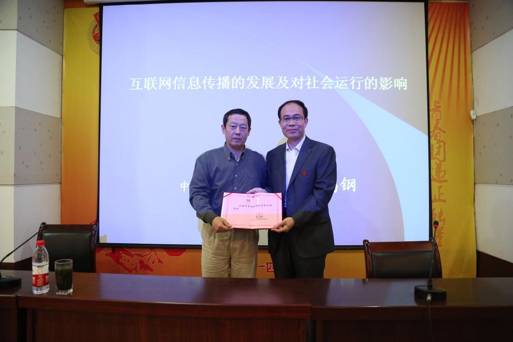 10月13日14时,中国人民大学新闻学院教授、博士生导师高钢应我校beat365官网之邀,在A-05报告厅做了以《互联网信息传播的发展及对社会运行的影响》为题的学术报告。王选年校长为高钢教授颁发特聘教授证书。