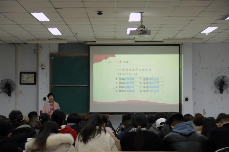 张校长首先以习总书记在党的十九大上的重要讲话为切入点,从“坚持实事求是、坚持战略思维、坚持问题导向、坚持全面协调、坚持底线思维、坚持调查研究、坚持抓铁有痕、坚持历史担当”等八个方面深入浅出又生动详实地讲解了马克思主义思想方法和工作方法。张校长用案例法教学,以自身经历和工作经验告诉大家,坚持实事求是,就要遵从事物客观存在的规律,学习生活即是如此,教书育人更亦如此。她结合“十年树木,百年树人”的教育理念揭示教育规律,鼓励青年学生要主动作为、主动担当,思接千载、视通万里,坚持把历史、现实、未来贯通起来,体现出强烈的历史担当,最终成长为合格的社会主义建设者和接班人。最后,张校长对学员提出殷切期望:希望大家用马克思主义武装头脑,既要仰望星空,更要脚踏实地,坚定理想信念,立德树人,努力成为德智体美劳全面发展的社会主义建设者和接班人。
