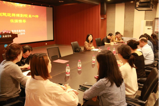 韩辉一行首先参观了现代传媒教学实验中心,对学院在实验室规划建设和管理使用方面取得成效给予高度评价。随后,在学院审片室与学院科级以上干部进行了座谈。