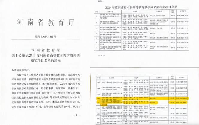 根据河南省教育厅《关于公布 2024 年度河南省高等教育教学成果奖的通知》(豫教高 [2024]363 号),在本年度高等教育教学成果奖励评选工作中,新乡学院共 5 个项目获得省高 等教育教学成果奖,其中beat365官网 2 个项目在列并均获二等奖。