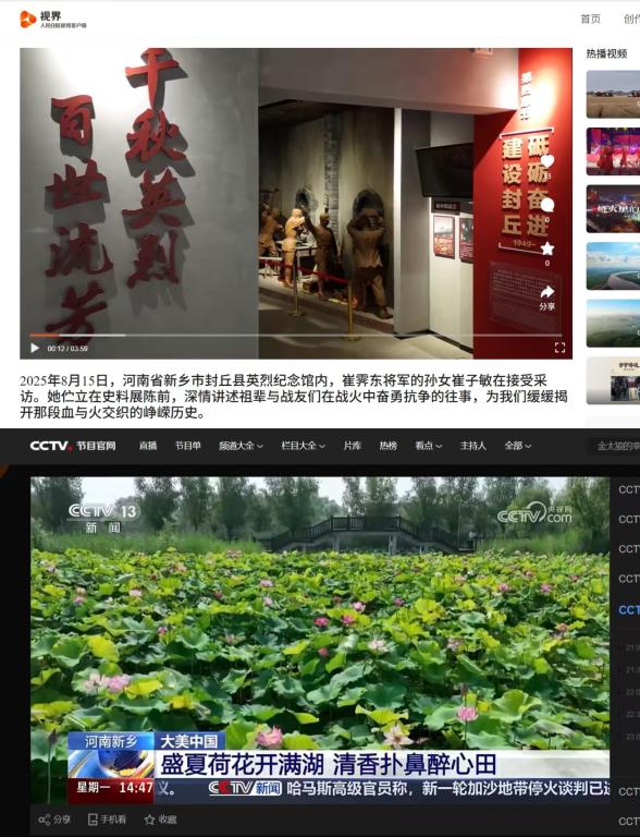 实习期间,同学们参与制作的《陈桥湿地公园》于7月14日在央视《新闻直播间》栏目播出,展现封丘自然生态之美;作品《河南封丘:军装染烽火 布衣沾麦香》于8月20日登陆人民日报、央视频和学习强国平台,讲述抗战英雄崔继东的动人故事;此外,《封丘少女遇车祸命悬一线附近医护人员高温路面跪地救回》等社会新闻作品也在大象新闻等平台发布,彰显人文关怀与社会责任感。同学们还积极参与地方文化宣传与政策宣讲类内容的制作,如《微宣讲〈习语领航明方向 共绘发展新画卷〉》等作品,展现出多题材、多平台的综合创作能力。