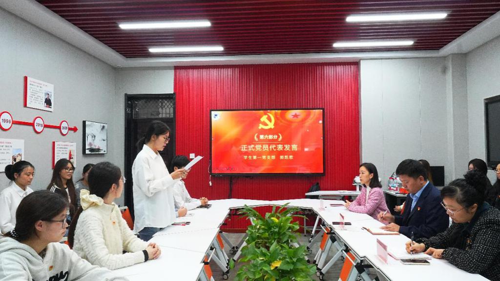 学生第一党支部郭凯歌作为正式党员代表发言。她表示身为共产党员,要牢记党员身份、保持学习热情、提高党性修养,让理论贯穿实践,为社会主义事业贡献力量。